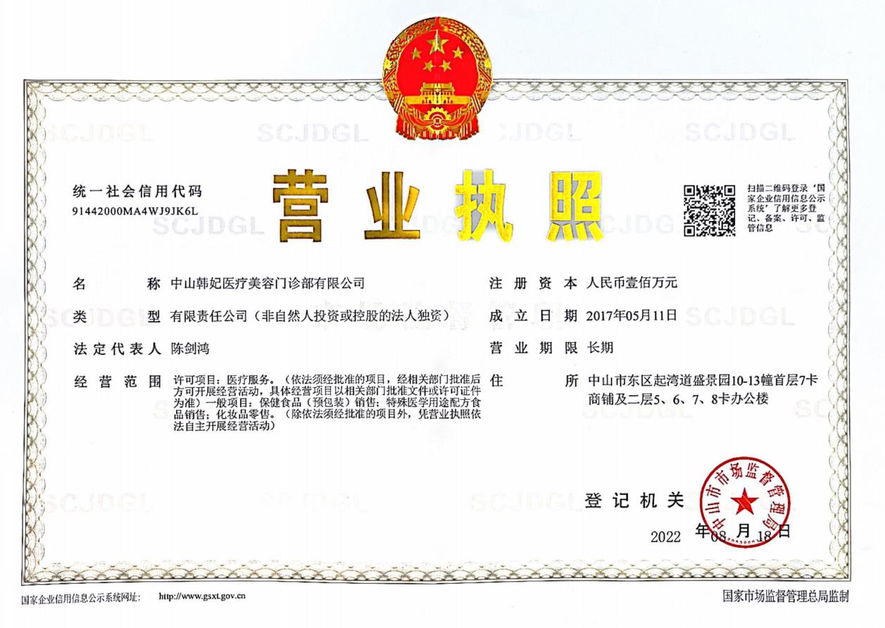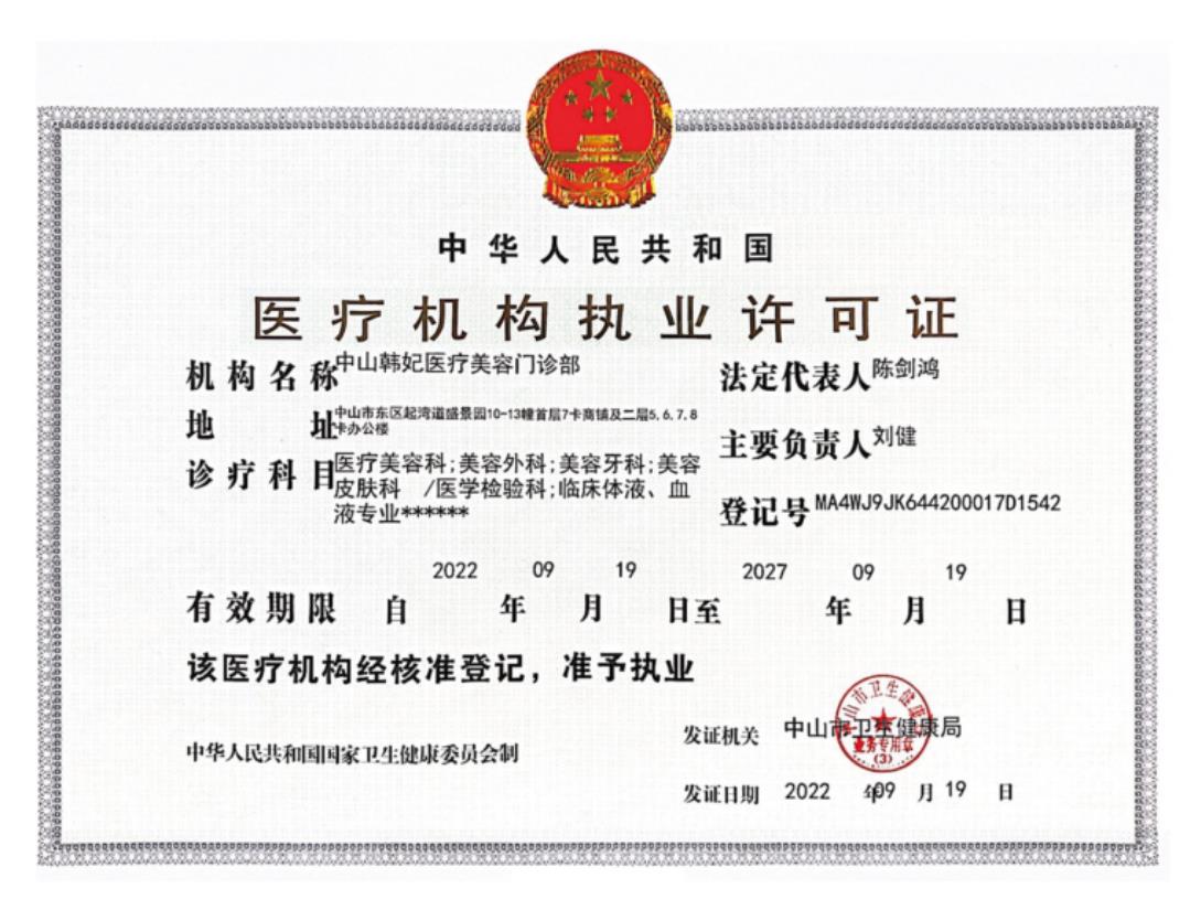 1. 單位名稱:中山韓妃醫(yī)療美容門(mén)診部有限公司
